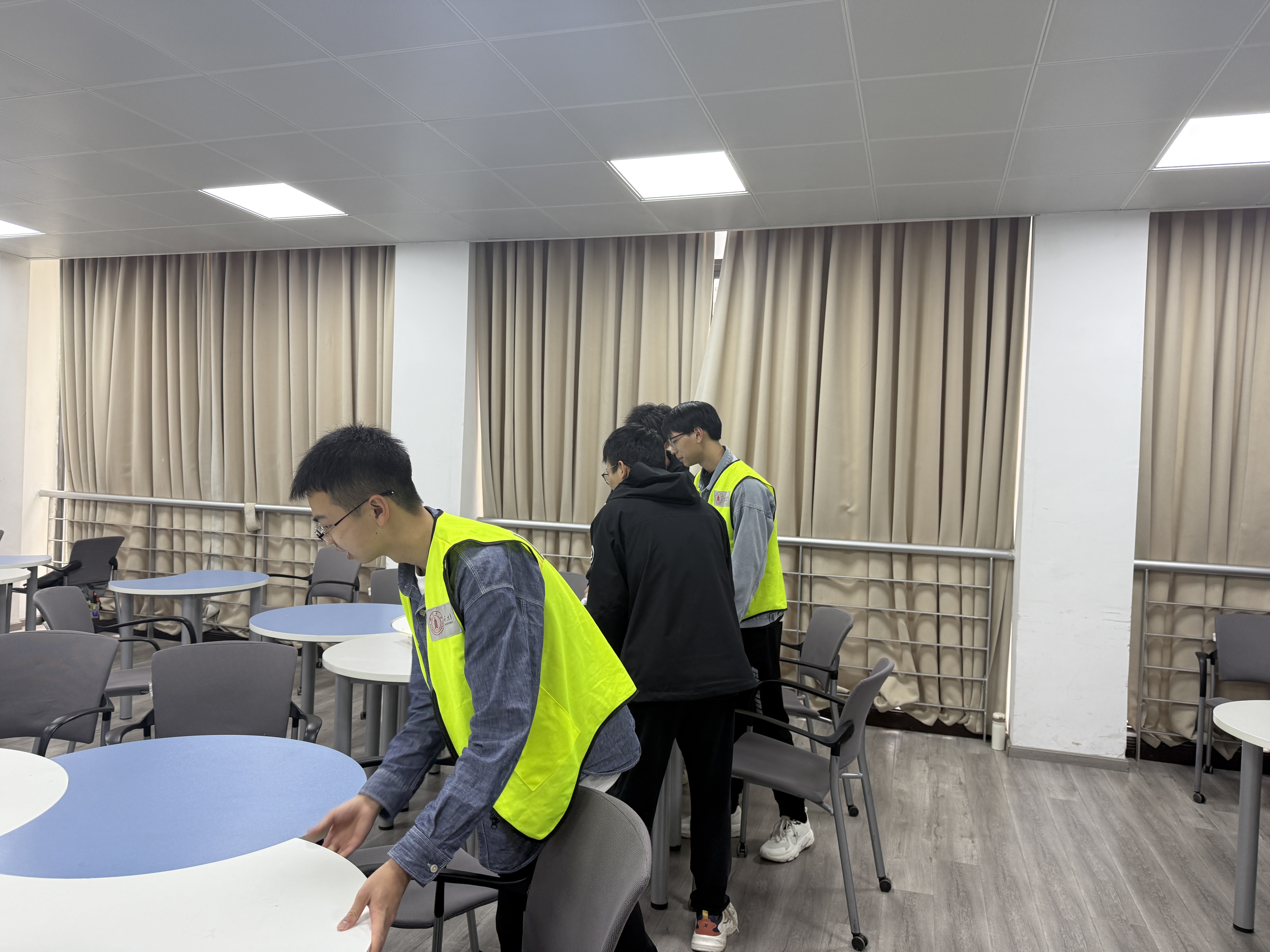 两组志愿者同步开展行动,第一组针对青春广场共享单车乱停乱放问题,扶正车辆、规范摆放并清理周边杂物,优化通行环境,倡导文明校园风尚;第二组前往综合楼B座及第一教学楼,整理归置杂乱桌椅、擦拭清洁、归置零散物品,为师生营造整洁舒适的学习办公环境,以贴心服务传递青春温暖。