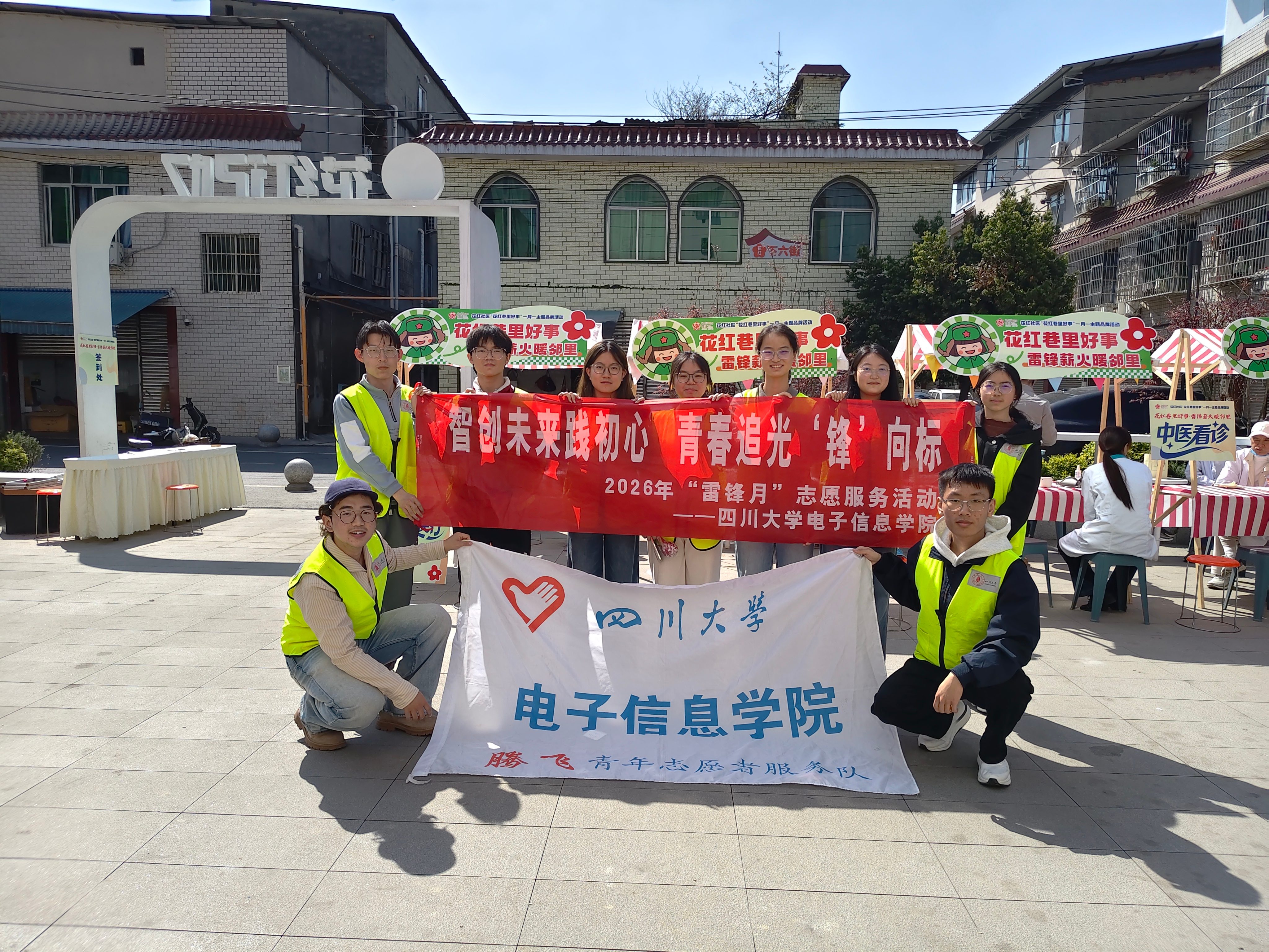3月26日上午,四川省成都市双流区花红小区内人头攒动、暖意融融。由花红社区主办、四川大学电子信息学院“腾飞”青年志愿者服务队协办的“花红巷里好事·雷锋薪火暖邻里”雷锋月主题活动在此举行。电子信息学院9名志愿者积极参与,协助开展便民服务、邻里互动及现场记录等工作,用实际行动践行雷锋精神。
