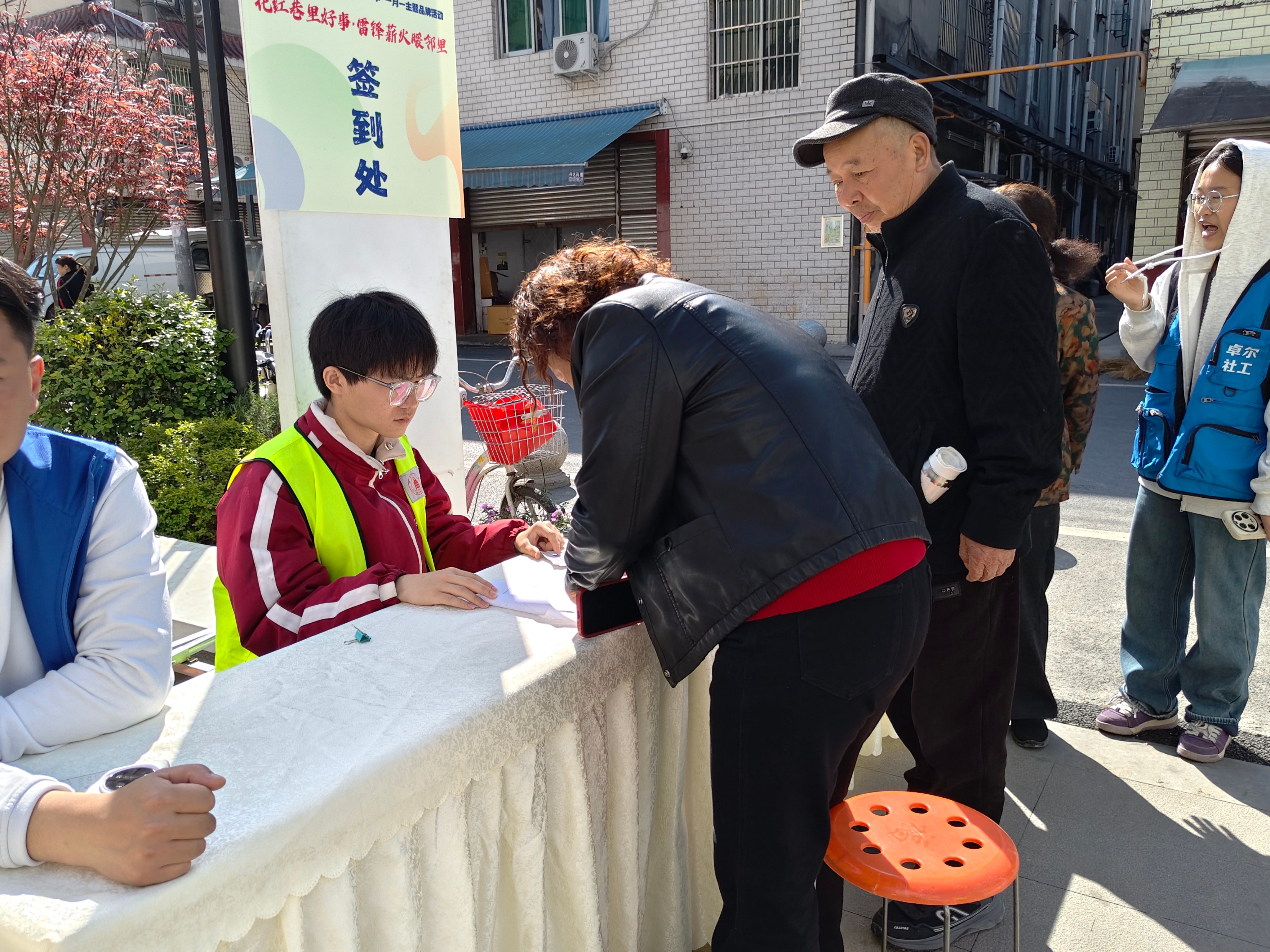 图为志愿者引导居民签到
