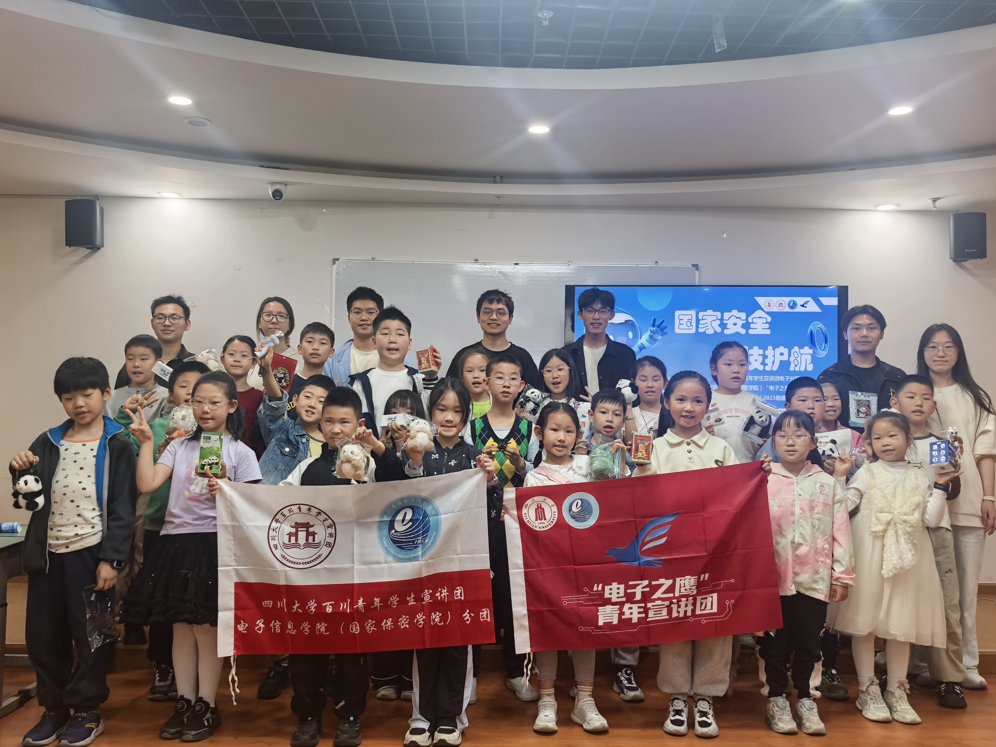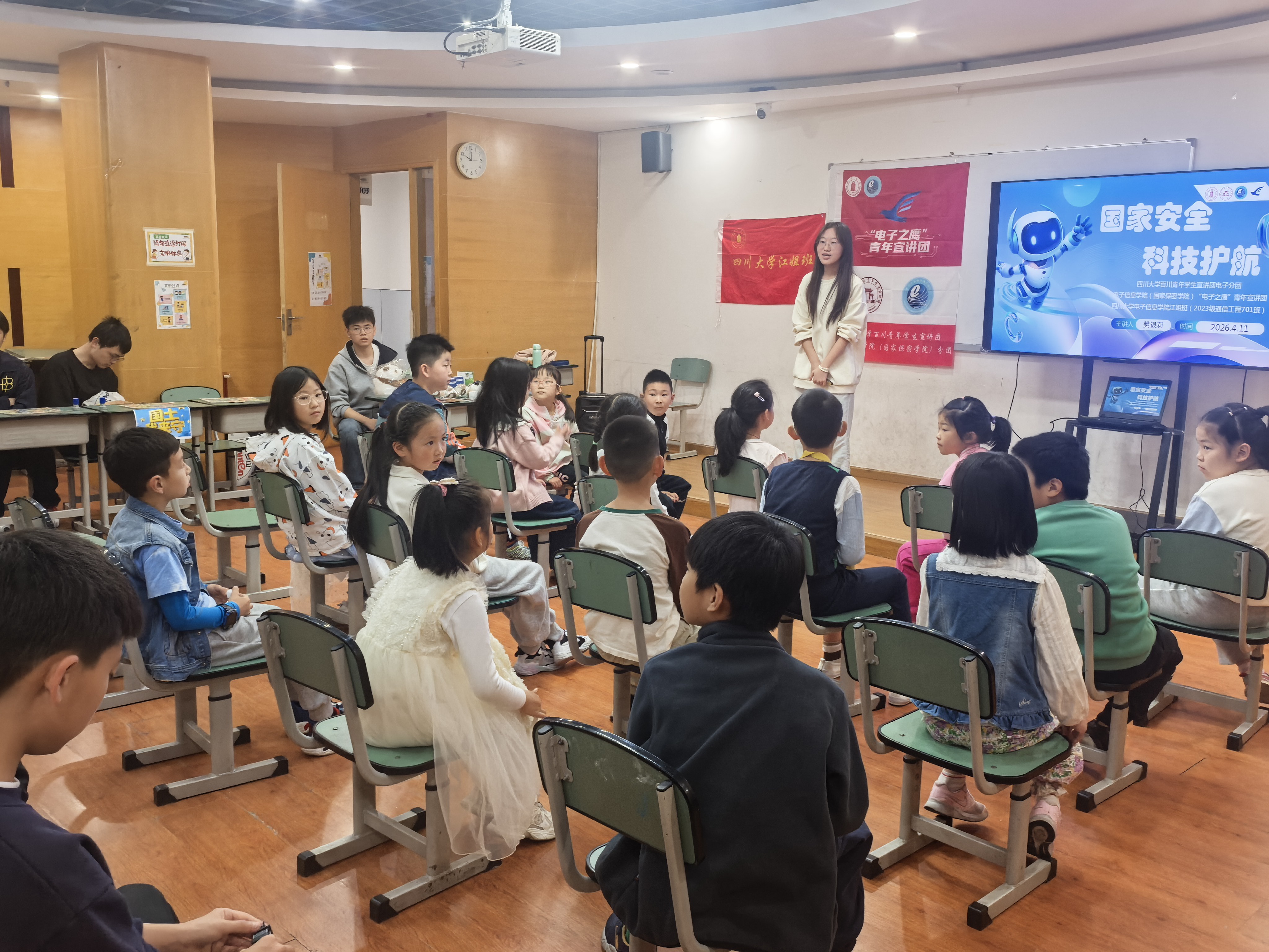 为深入贯彻总体国家安全观,以青少年喜闻乐见的形式普及国家安全知识,2026年4月11日上午,四川大学百川青年学生宣讲团电子分团、电子信息学院“电子之鹰”青年宣讲团,联合电子信息学院江姐班(2023级通信工程701班),走进武侯区青少年宫,面向7—12岁少年儿童开展“国家安全,科技护航”主题国家安全教育宣讲活动,25名小朋友现场参与。