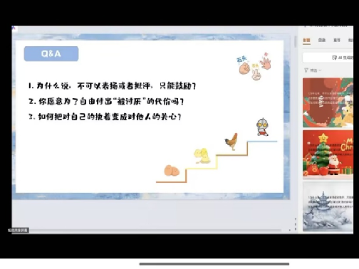 在答疑环节,提出了两个关键问题:“为什么不可以批评或者表扬,只能用鼓励?”以及“你愿意为了自由付出被讨厌的代价吗?”发言人回应道,课题分离要求我们阻止别人干涉我们的课题,有时需要明确地说“不”,尽管可能被讨厌,但这是自己的选择。将对自己的执着转化为对他人的关心,需要投入到共同体中,建立归属感。