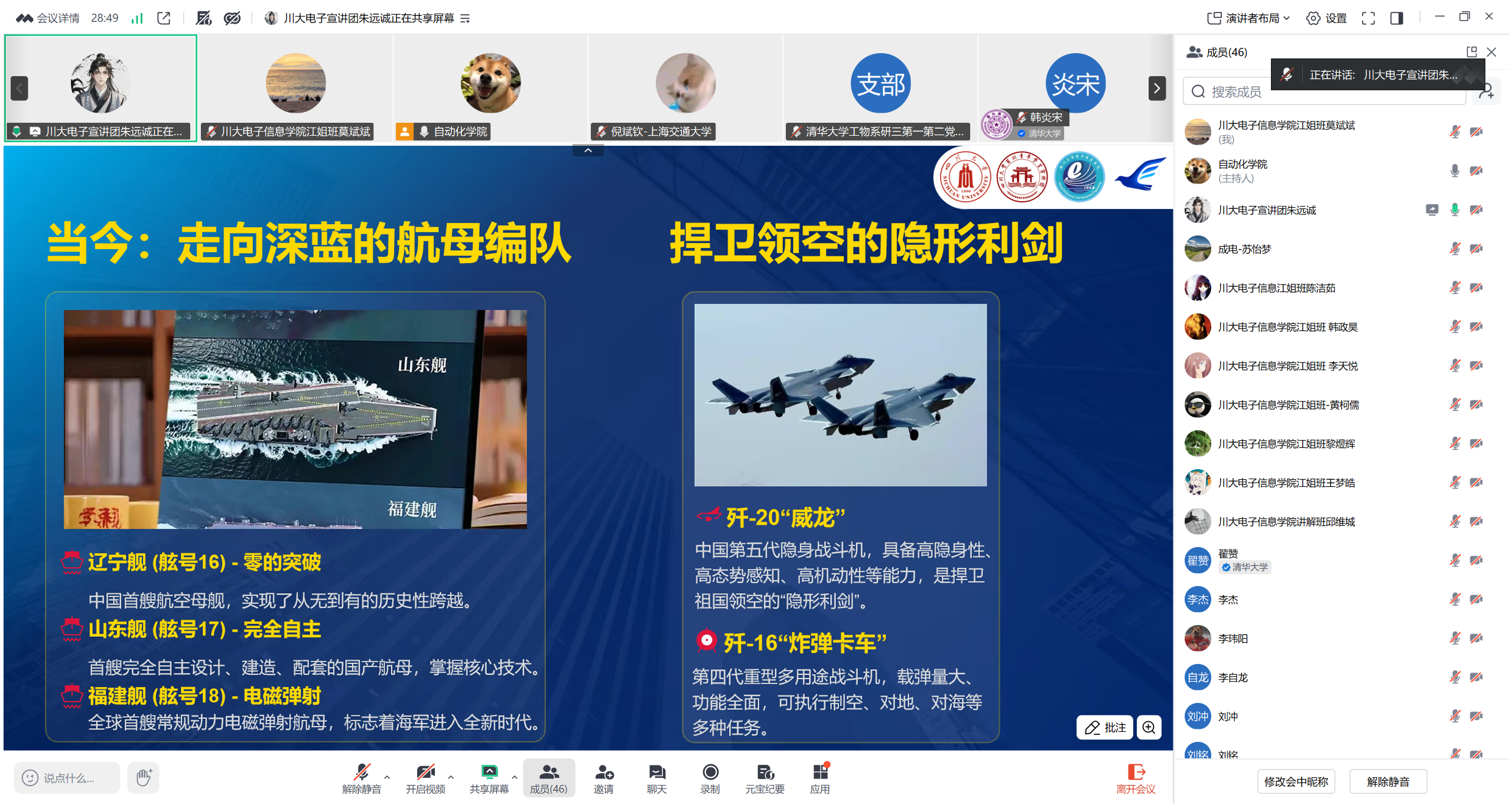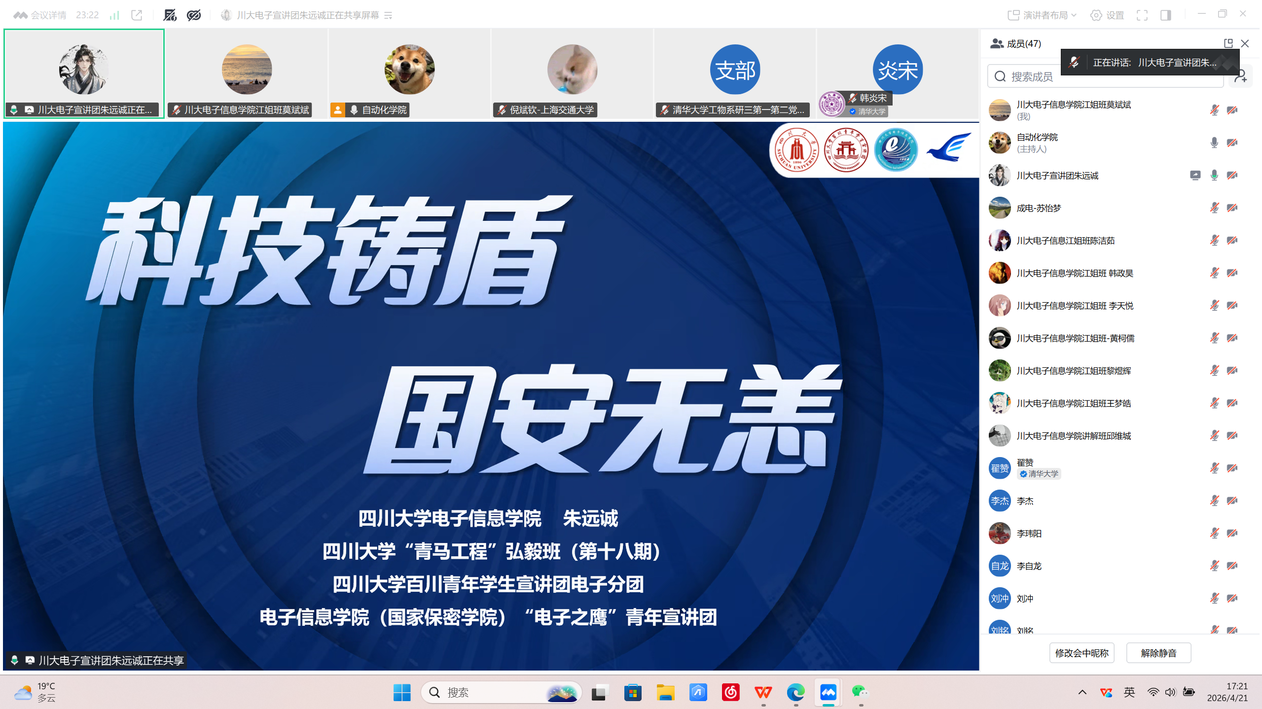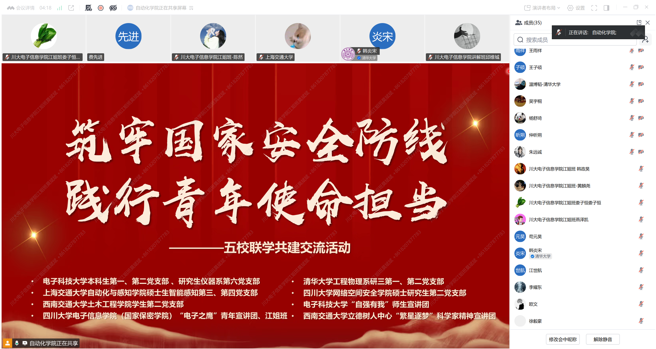 为深入贯彻总体国家安全观,推动国家安全教育在工科领域走深走实,4月21日下午,由电子科技大学发起,联合清华大学、上海交通大学、四川大学、西南交通大学举办“筑牢国家安全防线,践行青年使命担当”五校联学共建交流活动,我院江姐班和百川青年学生宣讲团电子信息学院分团、电子信息学院“电子之鹰”青年宣讲团代表受邀参加并进行“科技铸盾 国安无恙”主题宣讲。