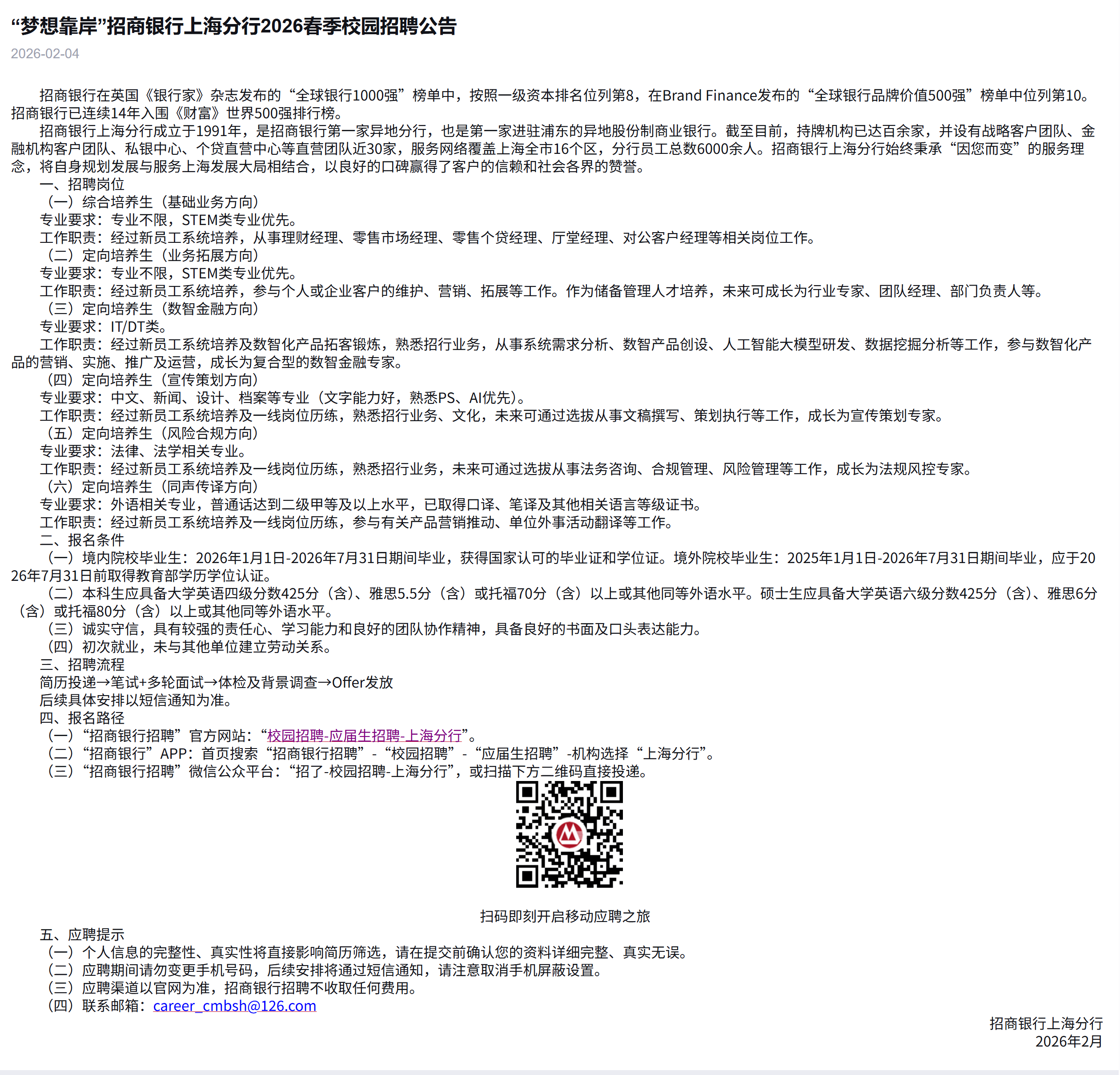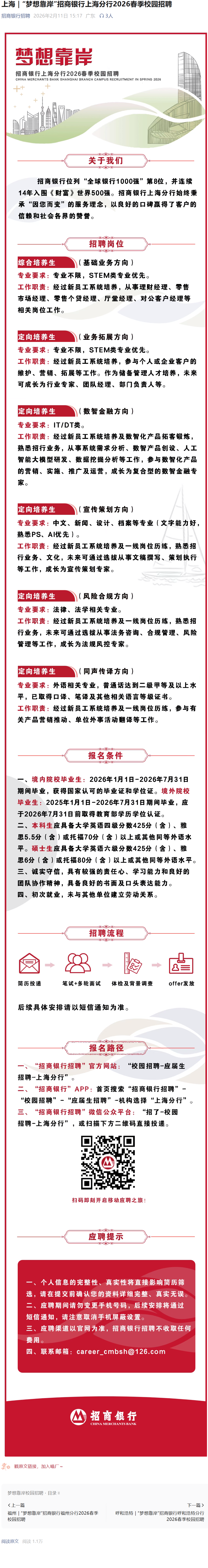 招商银行上海分行春招启动!