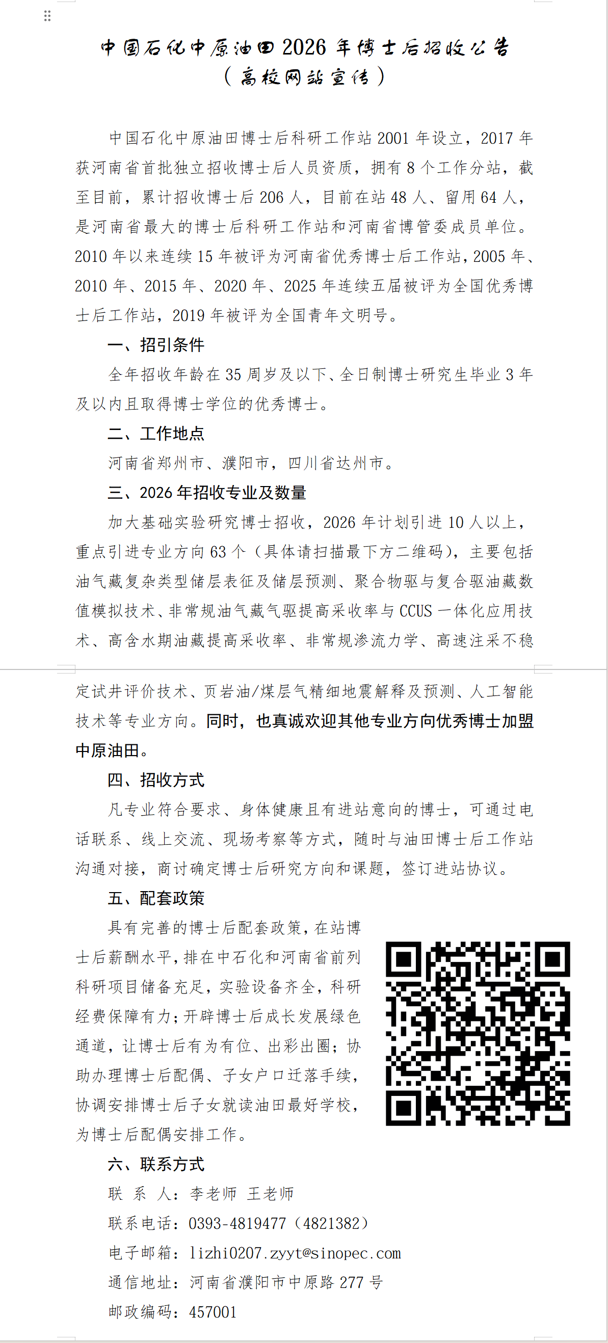 中国石化中原油田2026年博士后招收公告