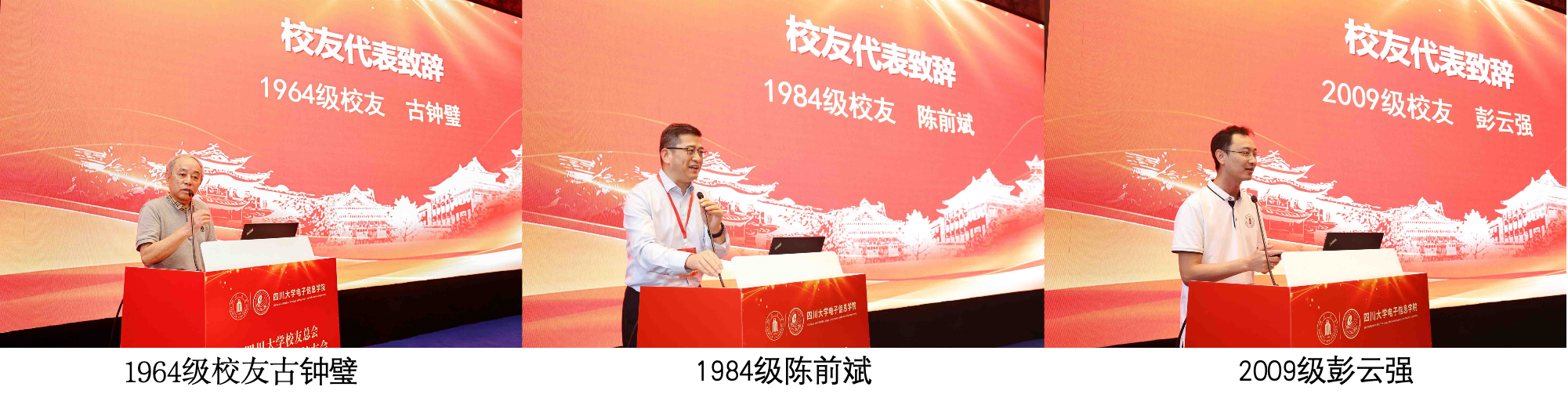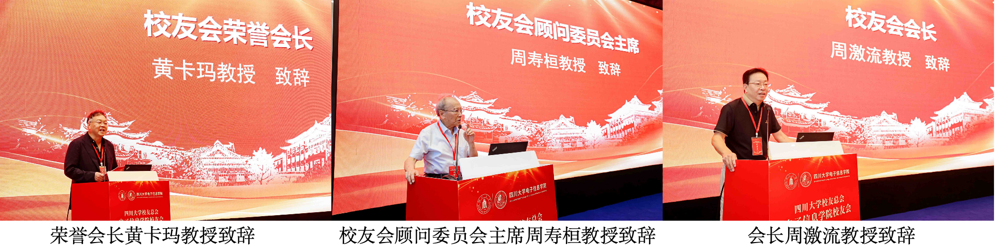 校友顾问委员会主席周寿桓教授、荣誉会长黄卡玛教授、会长周激流教授先后致辞。周寿桓教授勉励校友们不忘初心,持续关注母校发展;黄卡玛教授强调校友是学院最宝贵的财富,希望电子校友们互帮互助、勇挑重担,以实际行动为母校争光;新当选会长周激流表示,将带领理事会积极搭建交流平台,为校友服务、为学院赋能。1964级古钟璧、1984级陈前斌、2009级彭云强作为校友代表发言,分享了奋斗历程,表达了对母校的感恩,并表示将积极参与校友会工作。
