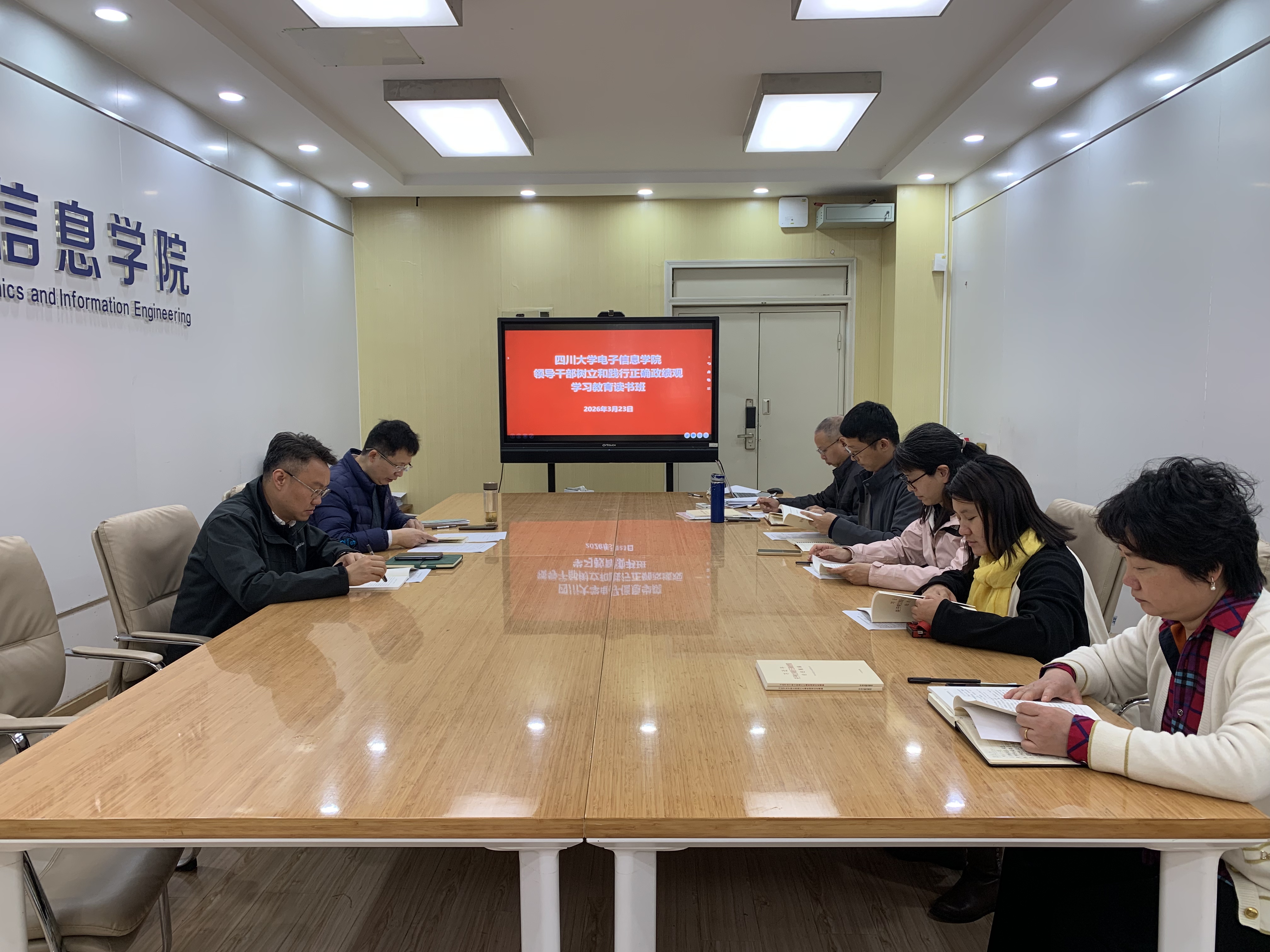 3月23日,电子信息学院在基础教学楼A110室举行了领导干部树立和践行正确政绩观学习教育读书班开班并开展集中学习。院党委书记彭舰主持会议并讲话,院领导班子成员、党委委员、专职组织员、院长助理等参加。