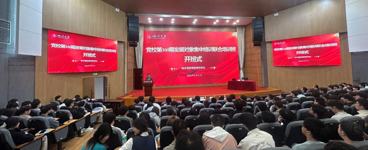 2026年4月11日上午,四川大学党校第160期发展对象集中培训联合培训班开班仪式在庄严的国歌声中隆重举行。由电子信息学院领办,来自电子信息学院、水利水电学院、机械工程学院、轻工科学与工程学院、生物医学工程学院、商学院、体育学院的发展对象齐聚一堂,共同学习。