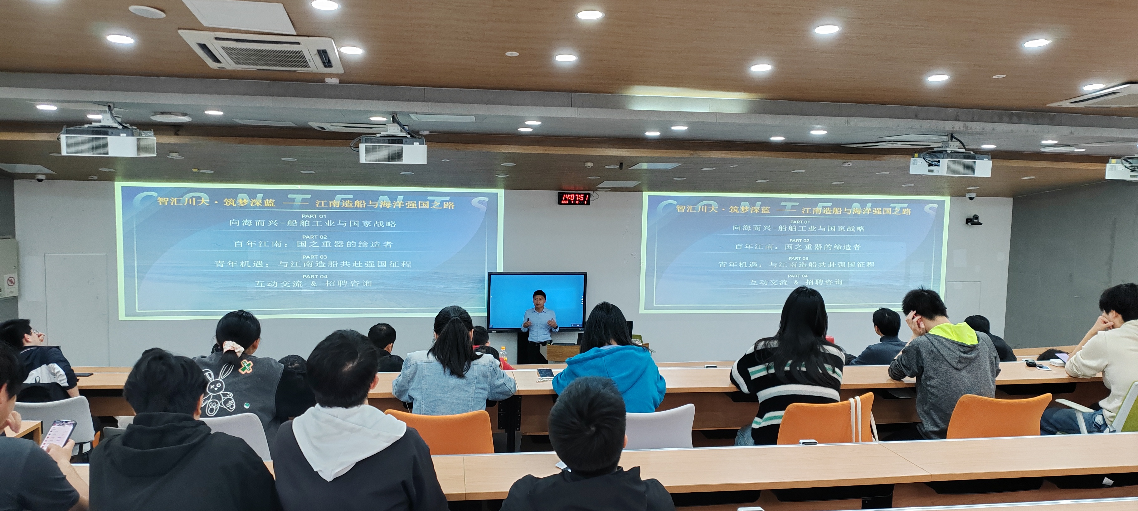 黄经理系统介绍了我国造船行业的重要性和江南造船的百年发展历程,阐明了电子信息技术作为船舶行业的重要作用,展示了江南造船在军用舰船、民用高端船舶领域的技术优势与人才培养体系,全面解读了企业的薪酬福利、生活保障与职业发展通道。