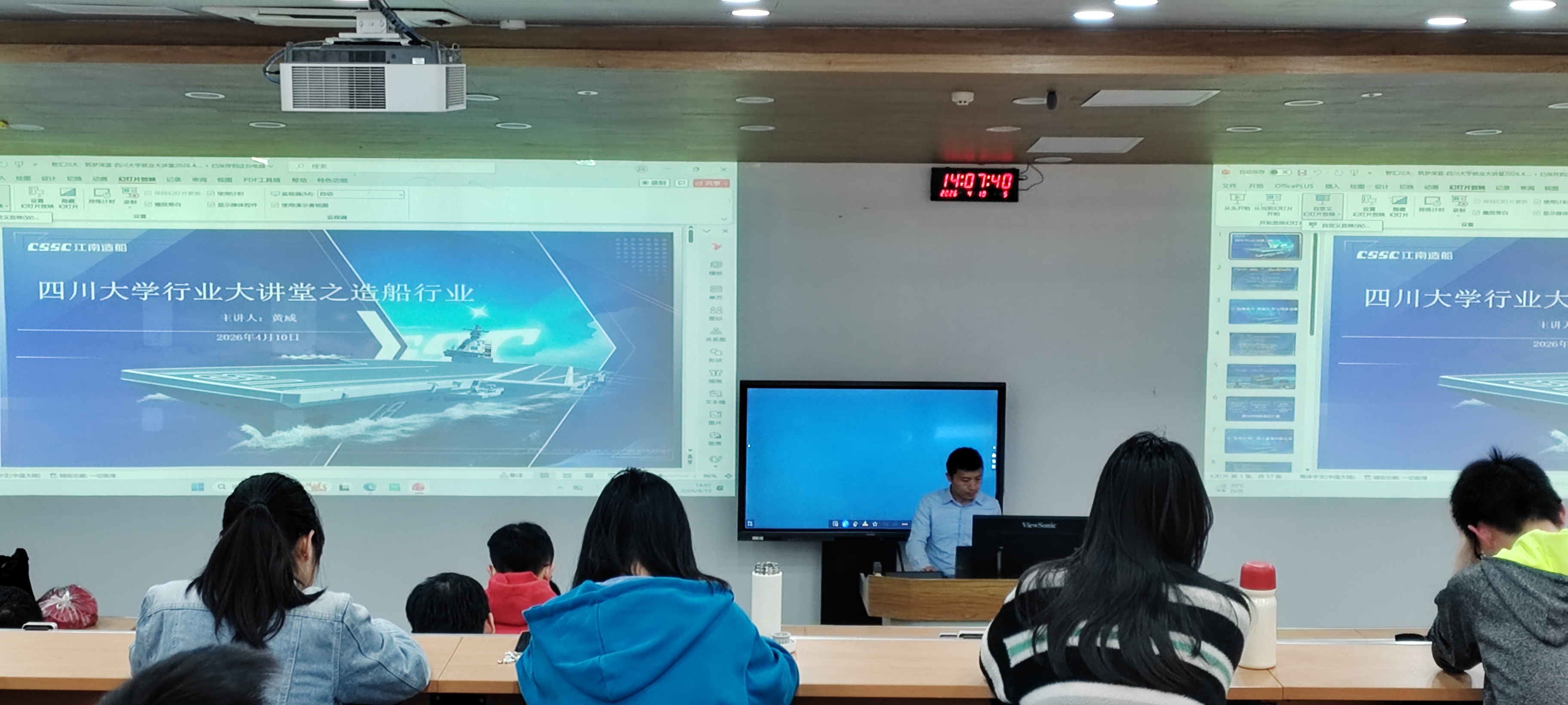 为搭建校园与企业对接桥梁,助力学子明晰职业方向,传递船舶领域前沿科技,2026年4月10日下午14点,行业大讲堂——造船行业在望江校区基础教学楼C座101教室成功举办。本次活动由四川大学就业指导中心与电子信息学院联合主办,特邀中船江南造船(集团)有限责任公司人力资源部高级经理黄威开展专题分享。