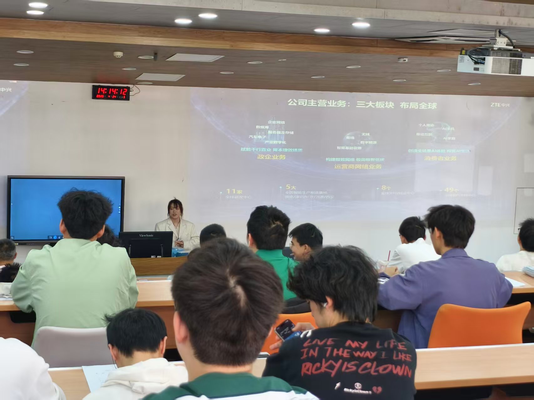 讲座中,嘉宾系统讲解了中兴公司的发展历程、行业优势、公司愿景,并重点介绍了中兴在政企业务、运营商网络业务、消费者业务的主营三大业务以及在AI、6G等新兴领域的技术突破与实践成果,生动展现了通信行业的最新趋势与未来方向。