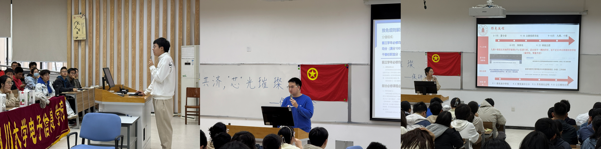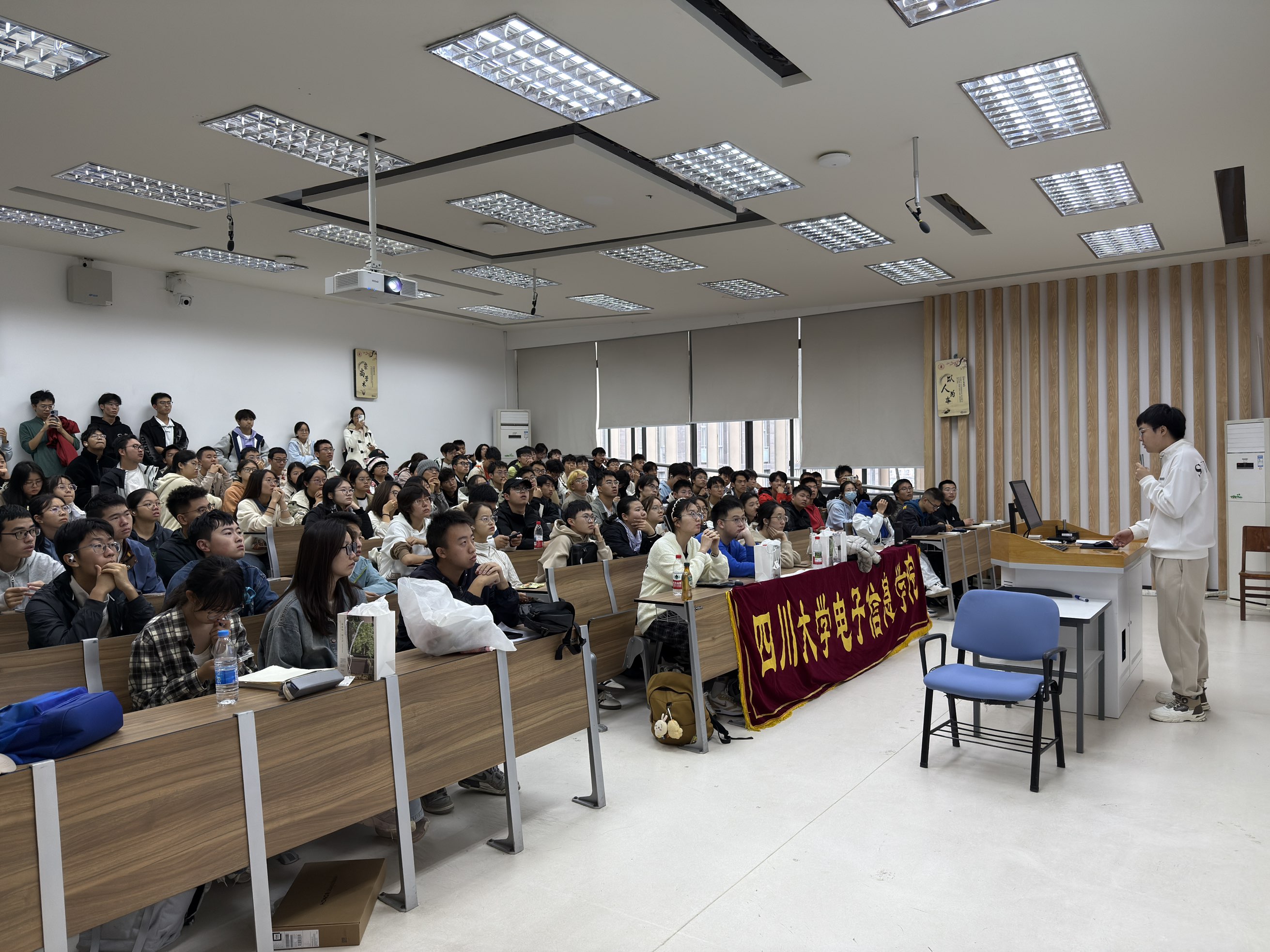 为破解保研信息壁垒,助力低年级学子明晰深造方向,2025年10月26日,院团委创就业与外联中心在江安校区综合楼C408教室举办“‘研’途共济,‘芯’光璀璨”保研分享会。5位已完成保研的学长学姐做分享经验,本科低年级学生参加,现场座无虚席。