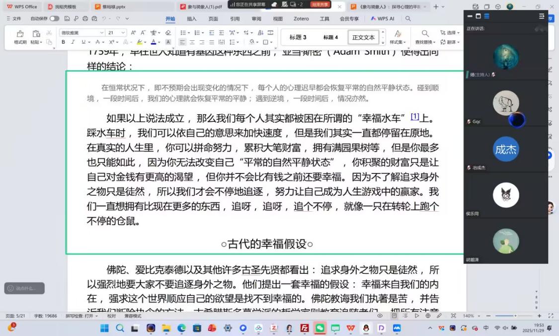 活动开篇,主持人以生动引言切入,梳理了本次阅读的主要内容。随后,参与同学通过线上发言,分享自己的初步思考。之后,主持人带领同学们深入拆解第四章内容。她围绕“自以为是”的核心,系统解读了人类普遍存在的认知与道德偏差。并结合具体生活场景,分析了这些心理机制如何催生人际冲突甚至极端行为,同时分享了自我审视、共情他人、冥想及认知疗法等驯服内心“大象”的破局方法,引导同学们反思自身可能存在的认知陷阱。