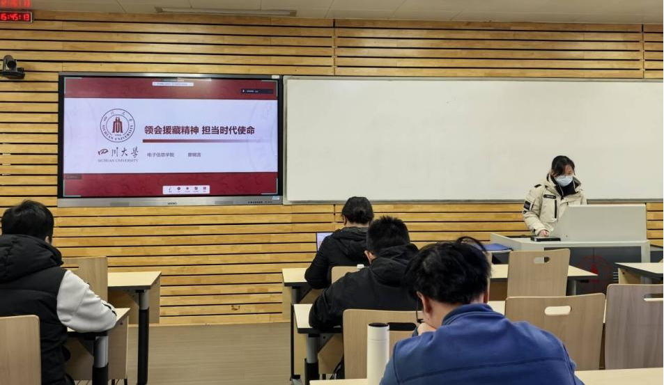 会上,廖婉言同学以“领会援藏精神,担当时代使命”为主题进行分享。她系统阐述了新时代党的治藏方略,围绕“稳定、发展、生态、强边”四件大事,深入解读了“倾注高原、无怨无悔”的援藏精神内涵,并结合孔繁森、钟扬等先进典型事迹,介绍了西藏在“十四五”期间清洁能源建设、南亚通道发展机遇及“珠峰英才”等人才政策,并号召全体党员将个人理想追求融入雪域高原长治久安和高质量发展大局,以实际行动践行科研报国使命。