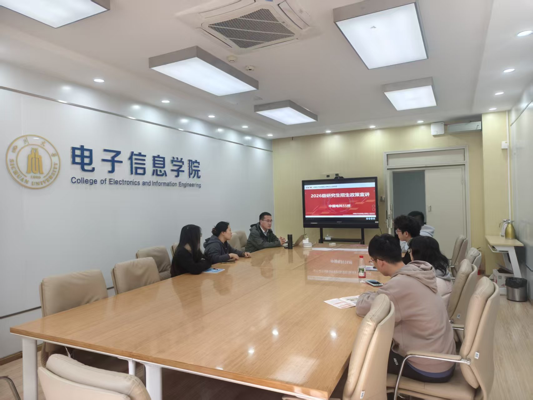 3月11日下午,中国电子科技集团公司第五十五研究所(下简称中电55所)在四川大学望江校区基教楼举办2026级研究生招生政策专场宣讲会。下午15点30分,电子信息学院相关负责人陈林老师主持活动,对中电55所招生处谢俊领老师的到来表示热烈欢迎。