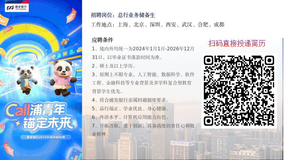 【招聘需求】总行业务储备生(科技类)、总行运营储备生、总行管理培训生等;