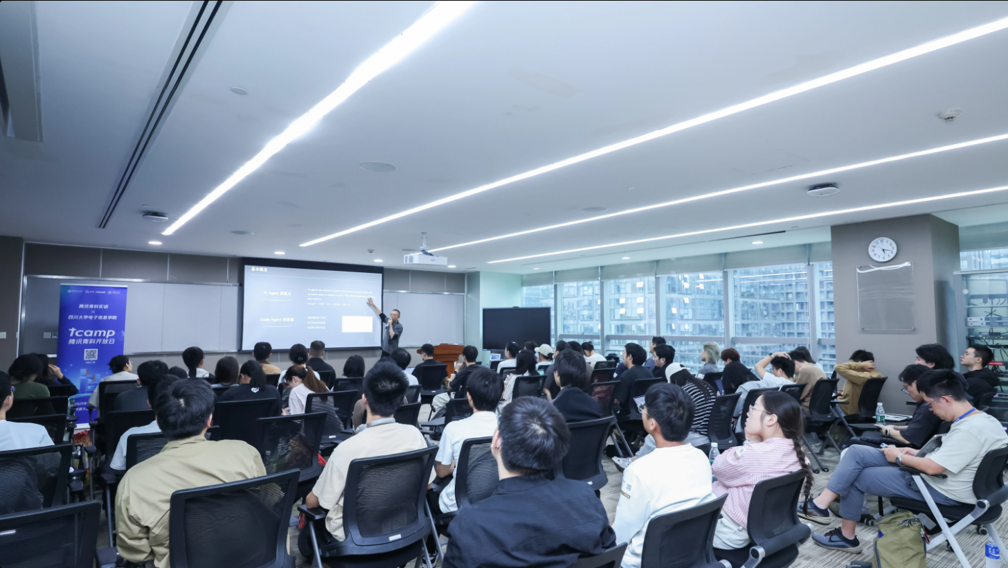 参观结束后,师生前往817会议室开展专题学习。腾讯学堂讲师以《大模型浪潮——生成式AI进展及应用趋势》为题,系统介绍腾讯在混元大模型、AI内容生成及行业解决方案等方面的最新进展;AI Coding板块技术专家围绕“AI编程发展趋势与腾讯工程实践”展开分享,现场演示腾讯云AI代码助手、规约编程平台等工具,并带领学生完成“模型实训+动手训练营”,通过实践深化对算法模型的理解。
