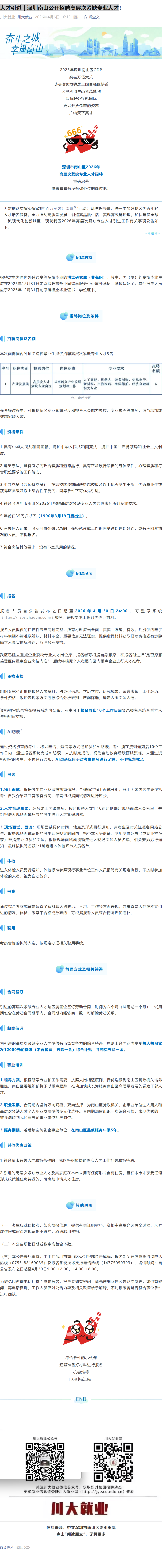 人才引进 深圳南山公开招聘高层次紧缺专业人才